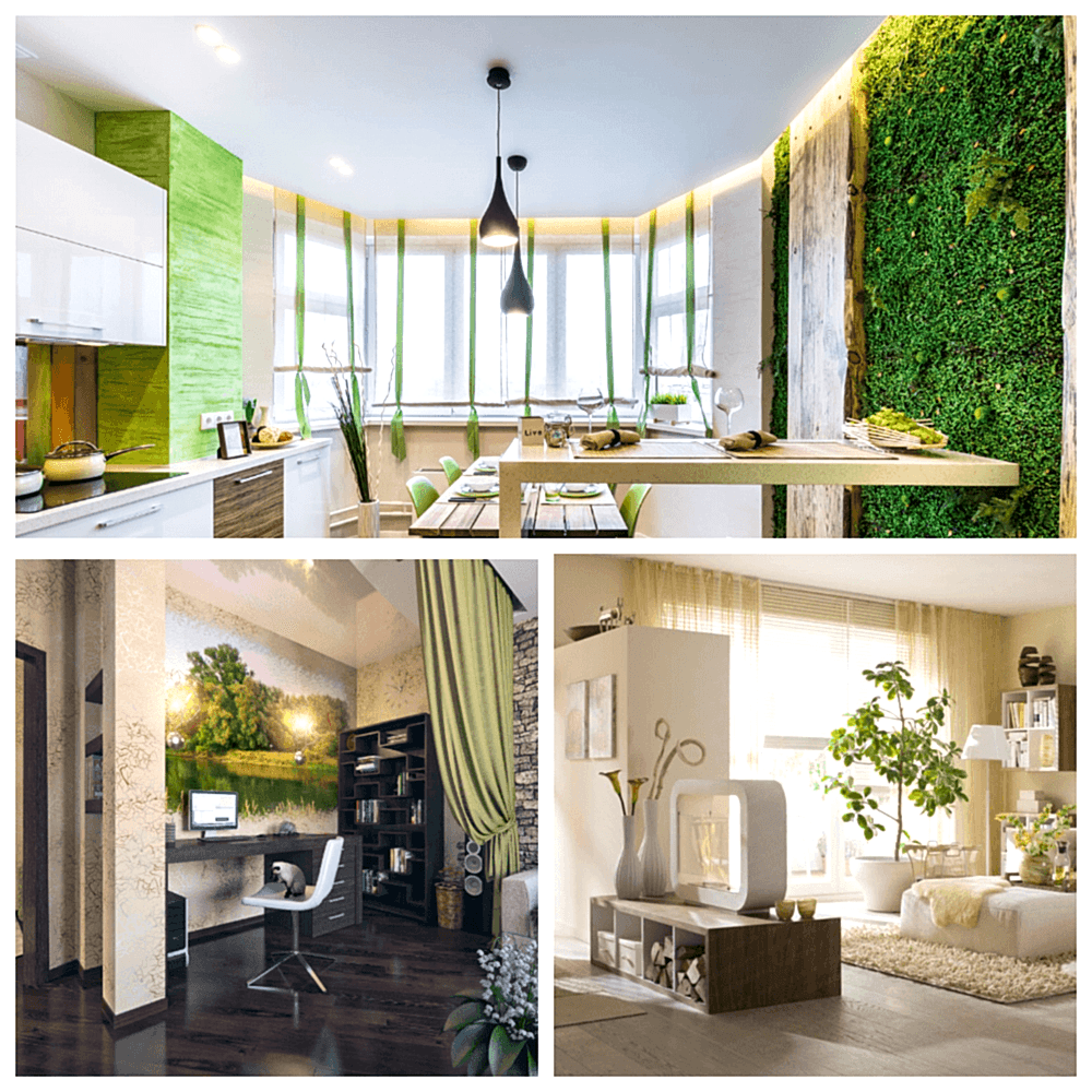 Если отделка, то гипсовая штукатурка, бумажные обои, пробковые полы, деревянные стеновые панели. Pin Up обязательно должны быть безвредны для человека, животных и окружающей среды. Оформление комнат изобилует зелеными растениями, плетеными элементами декора.